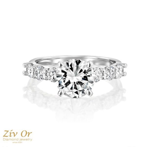 טבעת אירוסין אצילית המשובצת במרכזה ביהלום ובצידי הטבעת מעוטרת ב 6 יהלומי צד טוטאל של 0.60ct.