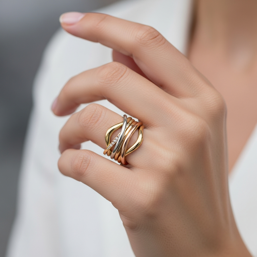 הדרך הקלה ביותר להתחיל היא עם טבעת אחת שכבר משלבת בתוכה את שני הגוונים. טבעת דו-גונית (Two-Tone) משמשת כ"גשר" ויזואלי ומעניקה לגיטימציה לשילוב של טבעות נוספות מכל אחד מהצבעים. היא קובעת את הטון ומבטיחה שהמראה הכללי ירגיש מכוון והרמוני ולא מקרי.